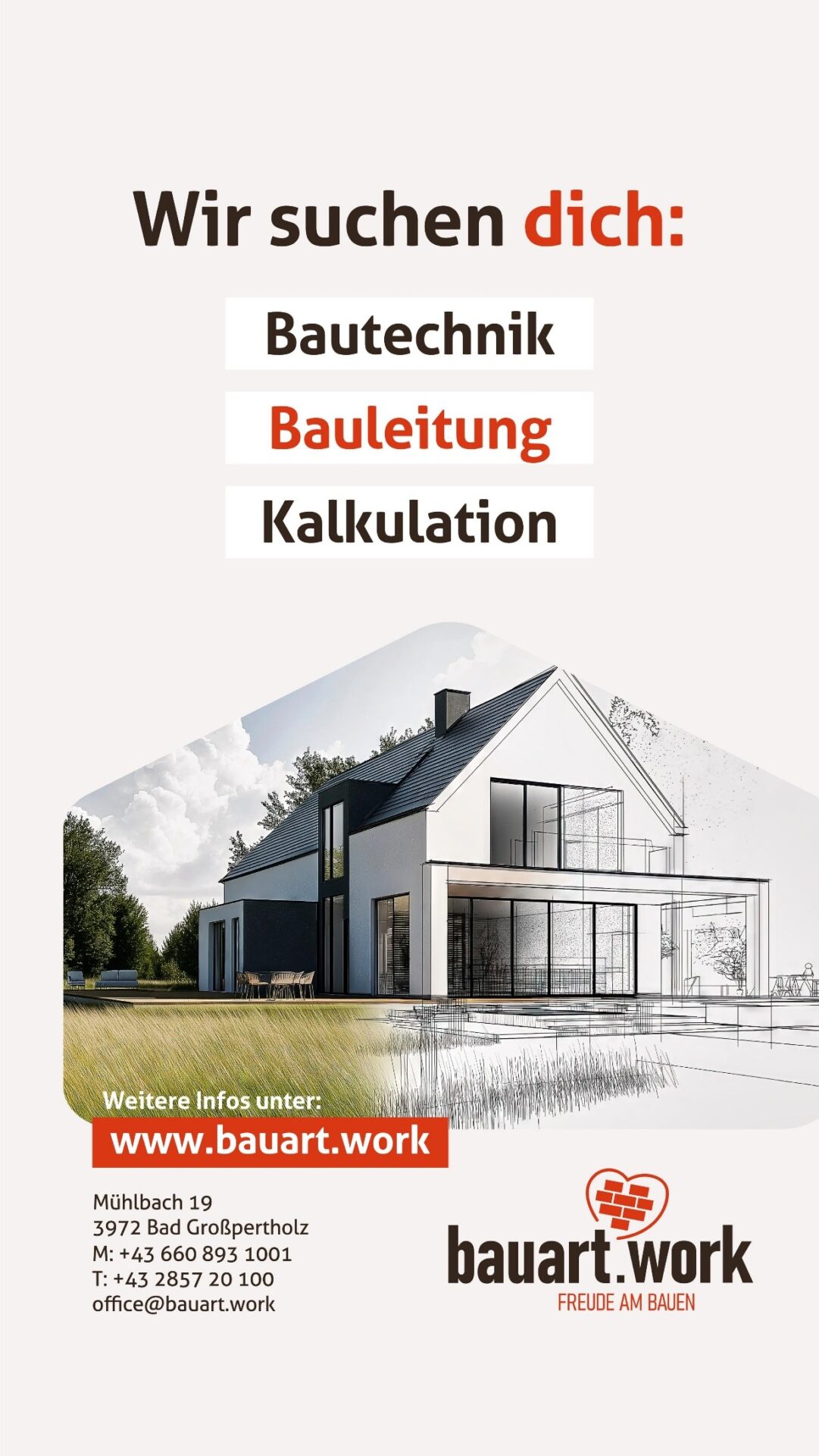 Wir von der bauart work leutgeb GmbH bauen mit Herz und Verstand. Als kompetenter Partner im Waldviertel realisieren wir individuelle Wohnträume – von der ersten Bodenplatte über den Kellerbau bis hin zum schlüsselfertigen Neubau oder der anspruchsvollen Sanierung. Bei uns trifft technisches Know-how auf echte Handschlagqualität. Zur Verstärkung unseres Teams in Bad Großpertholz suchen wir eine motivierte Persönlichkeit, die Projekte nicht nur verwaltet, sondern aktiv mitgestaltet.